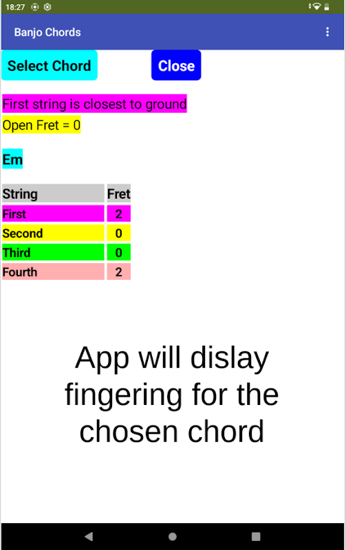 Ta aplikacja została zaprojektowana przez gracza na banjo, który rozumie typowe problemy, z jakimi borykają się muzycy, gdy po raz pierwszy biorą do ręki banjo. Prosta lista rozwijana pozwala użytkownikom wybrać akord. Aplikacja wyświetli następnie struny i progi potrzebne do uderzenia doskonałego akordu durowego, molowego lub septymowego. Akordy są przeznaczone dla 5-strunowego banjo z otwartym strojeniem G (G-DGBD). Struny są oznaczone jako pierwsza, druga, trzecia i czwarta, przy czym pierwsza znajduje się najbliżej ziemi. Otwarty próg jest oznaczony przez O. Użytkownik nie będzie potrzebował intensywnego szkolenia muzycznego ani wyjątkowej znajomości tego instrumentu. Ćwicz akordy często pojawiające się w bluegrassie i innych gatunkach, sprawdź swoją wiedzę i baw się dobrze, poznając ten przyjazny instrument!