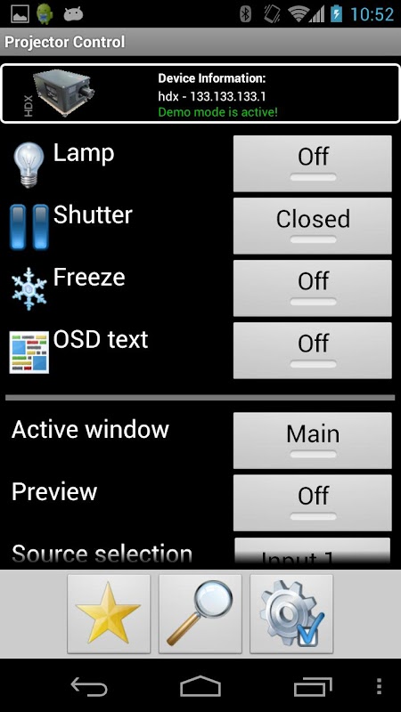 Currently we have an Android app that can easily serve as a user-friendly, advanced projector remote control. All traditional remote control functionalities are available with on top, an indication of the current status. Differentiating from the traditional remote control is the quick access to all the available test patterns with their options, which means a great help for service technicians. Supporting fast switching from one projector to the other is another big advantage.