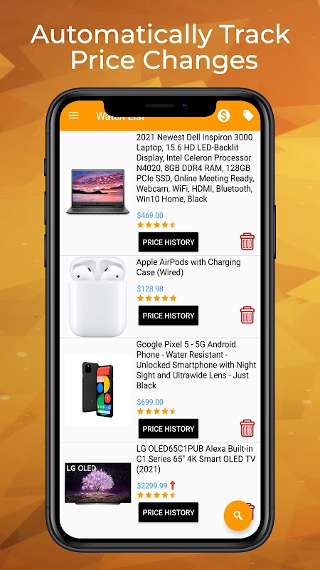 Skanuj kody kreskowe i dodawaj produkty z Amazon.com do listy obserwowanych i śledź ich ceny. Otrzymasz powiadomienie, gdy cena spadnie do wybranej przez Ciebie ceny.