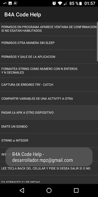 Con una lista muy amplia de temas prácticos producto de utilizar ésta excelente plataforma de programación se mostrará el código para insertar en sus programas. Ideal para el programador principiante y avanzado. Con esta apk ahorrará tiempo de investigación y búsqueda.