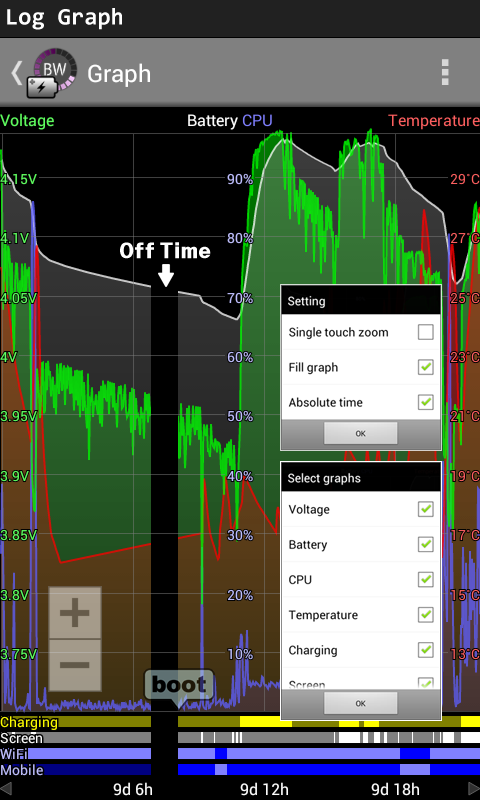 5. Temperature, voltage, battery life, charging, screen status logging.