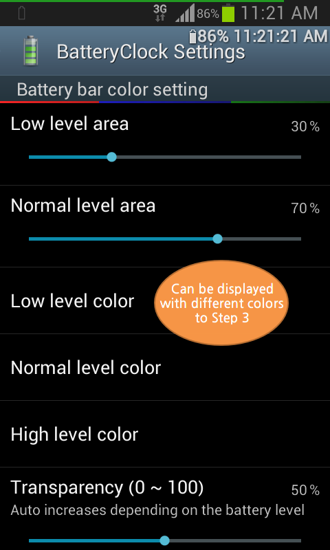 - Zmiana koloru poziomu baterii według trzech etapów (obszar scena, kolor może być ustawiony)