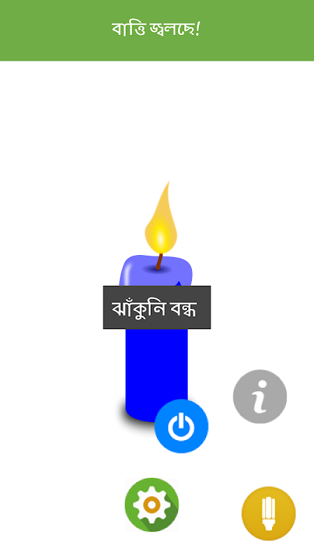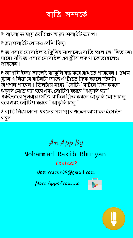 বাংলা ভাষায় তৈরি প্রথম ফ্লাশলাইট অ্যাপ । আপনার মোবাইল ঝাঁকুনির মাধ্যমেও বাতি জ্বালানো নিভানো যাবে। যদি আপনার মোবাইল এর স্ক্রীন লক থাকে তাহলেও পারবেন । আপনি ইচ্ছা করলেই ঝাকুনি বন্ধ করে রাখতে পারবেন । প্রথম স্ক্রীন এ নিচে যে বাটনটা আছে ঐ টাতে ক্লিক করলে তিনটা অপশন পাবেন । তিনটার মধ্যে "সেটিং' বাটনে ক্লিক করলে ঝকুনি মোড বন্ধ হবে এবং নোটিশ করবে "ঝকুনি বন্ধ"। একইভাবে পুনরায় সেটিং বাটনে ক্লিক করলে ঝাকুনি মোড চালু হবে এবং নোটিশ করবে "ঝাকুনি চালু "।