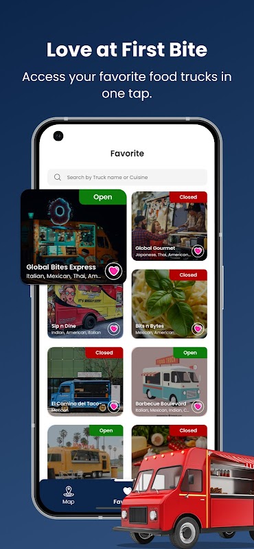 - Szczegóły ciężarówki z jedzeniem: przeglądaj opisy ciężarówek, obrazy menu i funkcje specjalne, takie jak dzwonienie do ciężarówki lub otrzymywanie powiadomień o aktualizacjach.