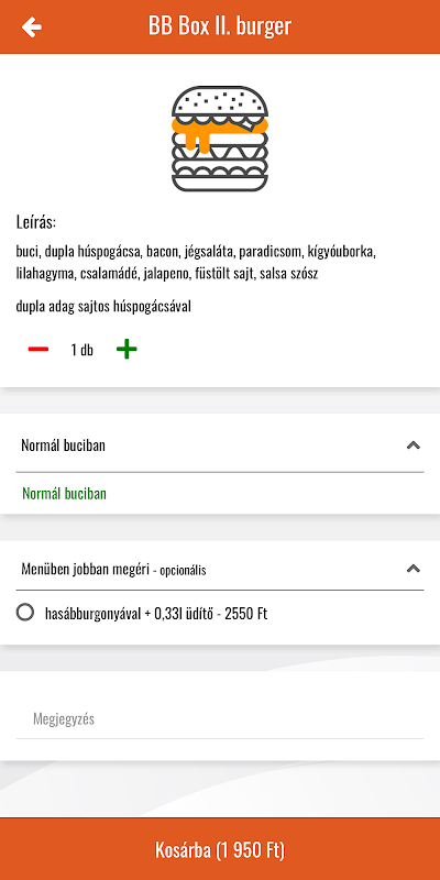 Menu BB Box Kitchen w Gödöllő oferuje różnorodne przysmaki. Oferuje szeroki wybór pizzy w 3 rozmiarach, a także hamburgery, dania rybne i pożywne półmiski. Jeśli masz ochotę na pożywny lunch lub kolację, zamów wygodnie przez aplikację!