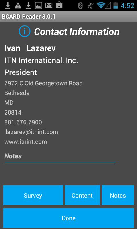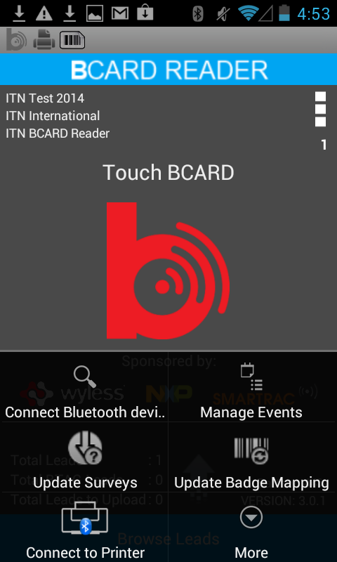 The trade-show and conference BCARD badge reading application, that allows you to capture and manage lead data on an Android phone or Tablet. BCARD's are contact-less 'touch-and-go' smart cards used at many trade shows to easily share contact data with colleagues and businesses. An NFC chip is required to read BCARD's and is available on many Android devices such as the Nexus S, Nexus 7, Galaxy Nexus, HTC One X, Sony Xperia S, Galaxy S3 and many others. Onsite rental of NFC capable Android devices is usually available, just look for the 'Lead-Retrieval' desk at the exhibition.