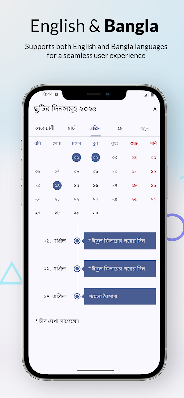 Łatwy dostęp do swojego roku i zarządzanie nim dzięki aplikacji Govt Holiday Calendar 2025 BD. Bądź na bieżąco z pełną listą সরকারি ছুটি i harmonogramami festiwali dla wszystkich religii, w tym muzułmanów, hinduistów, chrześcijan i buddystów. Niezależnie od tego, czy szukasz kalendarza świąt Bangladeszu na rok 2025, czy kalendarza rządowego na rok 2025, w tej aplikacji znajdziesz wszystko.