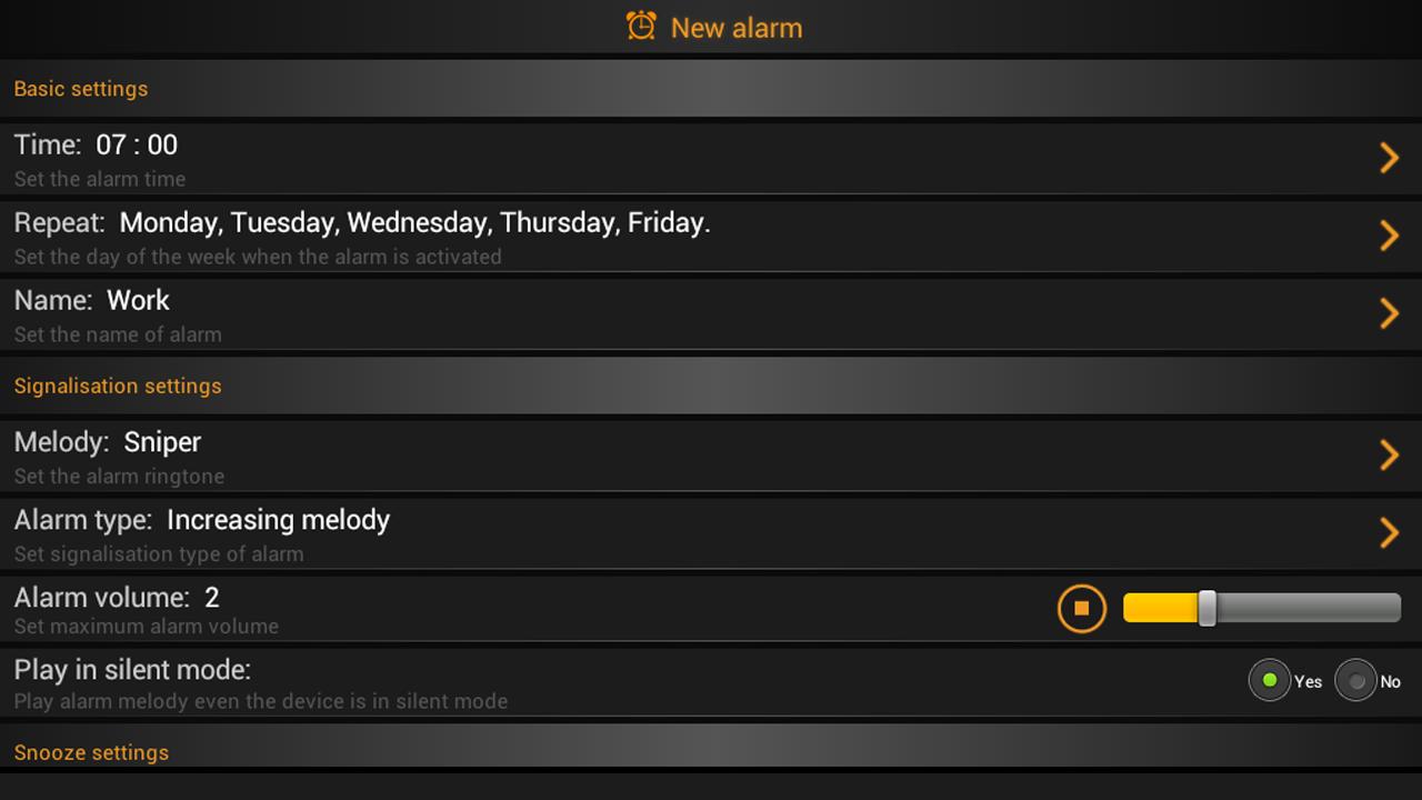 - Alarm snooze time customizable ( 5, 10, 15, 20, 25, 30 minutes and never )