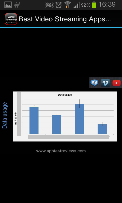 The contents of this app is for informational purposes only. It presents real-world results of data usage and battery consumption of the most popular video streaming apps under standard conditions. Youtube, Vimeo and RealPlayer are popular apps for Android smartphhones and tablets, and as such were reviewed in this comparitive analysis.