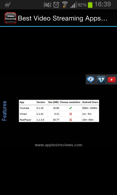 Review and comparison of Youtube, Vimeo and RealPlayer video streaming apps.