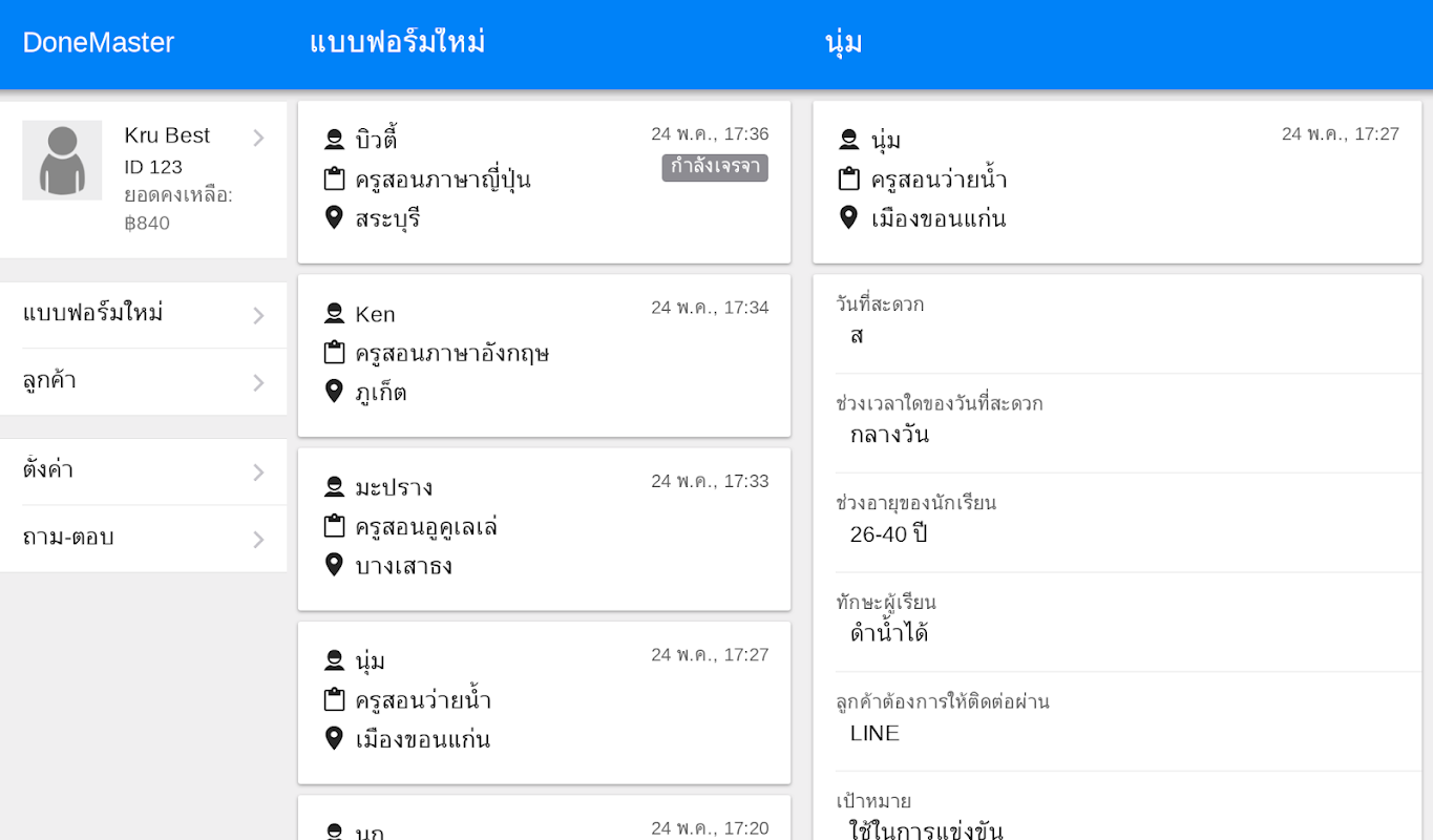 Poznaj formę klientów, którzy mają ochotę zatrudnić korepetytora. Wybierz formę klienta, z którym chcesz się skontaktować i przedstaw swój tutorial. Zapłać minimalną opłatę w wysokości 30-50 bahtów, aby uzyskać dostęp do danych kontaktowych klientów i bezpośrednio z nimi kontaktować.