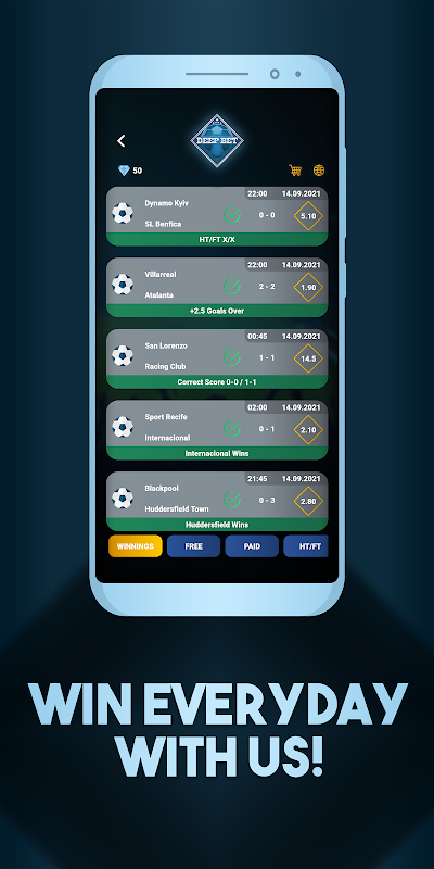 Aplikacja zawiera sekcje bezpłatne, płatne, Ht/Ft, Premium i Deep Elite, które są aktualizowane codziennie. Wskaźnik wygranych wskazówek dostarczonych przez zespół analityków Deep Bet wynosi od 90% do 98%. W sekcji Darmowe mecze są dzielone między kursami 1,30 a 1,90, podczas gdy prognozy w sekcjach Płatne i Subskrypcja wynoszą od 2,00 do 25,00 na mecz. Cechy;