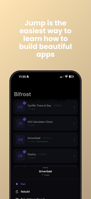 Udostępniaj swoje prace w toku członkom zespołu, projektantom lub klientom. Zainstalują oni Jump raz i będą mogli wyświetlić podgląd dowolnej tworzonej przez Ciebie aplikacji NativePHP. Zbierz opinie na temat rzeczywistych urządzeń przed rozpoczęciem pełnego cyklu kompilacji.