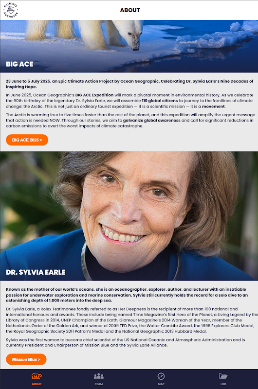 Zorganizowany przez Ocean Geographic Society of OceanNEnvironment Ltd na pokładzie MV Sylvia Earle, statku ekspedycyjnego obsługiwanego przez neutralną pod względem emisji dwutlenku węgla firmę Aurora Expeditions, BIG ACE oddaje hołd dr Sylvii Earle, założycielce Mission Blue i pierwszej Bohaterce Planety magazynu Time.