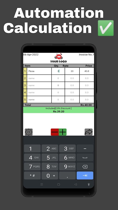 Rachunek z własnym logo, predefiniowana lista produktów lub pozycji, automatyczny numer faktury, automatyczna data, bezpośrednie udostępnianie w komunikatorze.