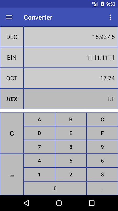 • Konwersja między liczbami binarnymi, ósemkowymi, dziesiętnymi i szesnastkowymi. Obsługiwane są liczby ułamkowe. Konwerter zawiera osobną klawiaturę dla każdego systemu liczbowego, co czyni go bardzo łatwym i szybkim w użyciu. Wartości można skopiować / wkleić.