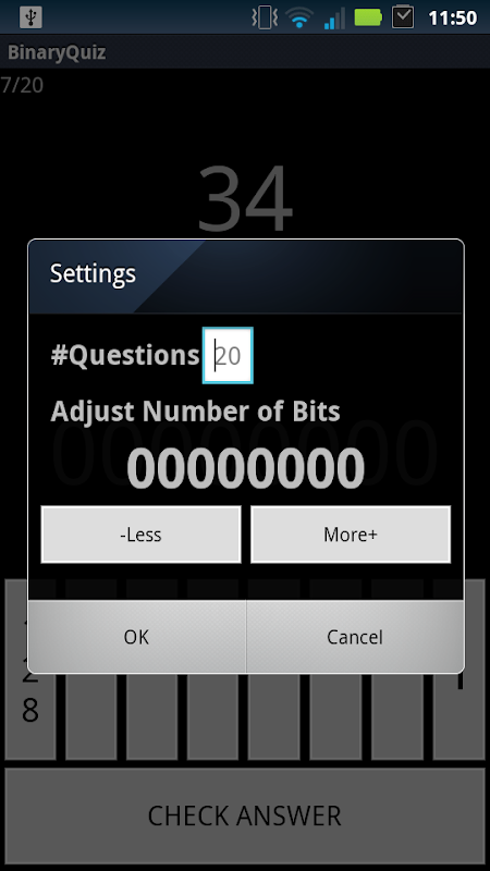 The app randomly generates a set of decimal numbers for you to attempt to convert to binary. Press the buttons to toggle the bits, then press check answer. If correct, you are rewarded handsomely and sent to the next question.