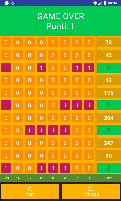 Aplikacja wymaga wybór bitów corrispodenti do liczby dziesiętnej wyświetlanego lub odwrotnie, typowania na liczbę dziesiętną odpowiadającą binarnej wniosku sekwencji. Trzeba odpowiedzieć na konwersje (które są dodawane co 5 sekund) zanim dotrą do góry ekranu.