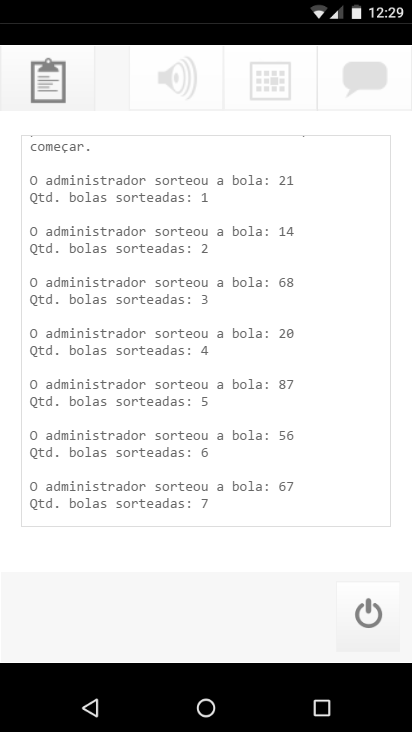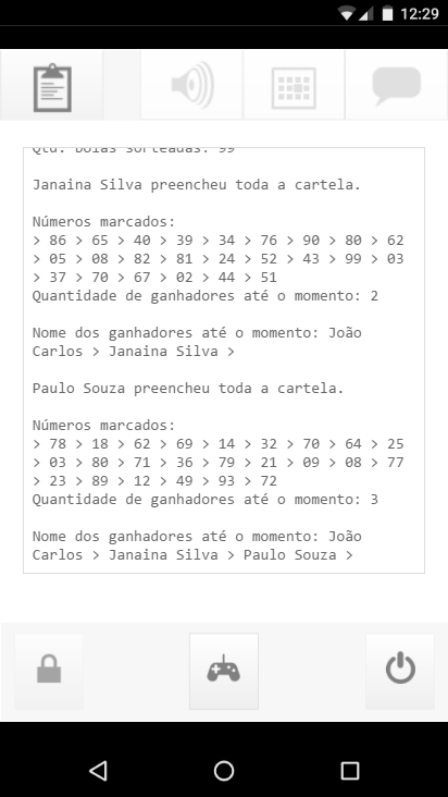Em caso de preenchimento total da cartela(24 números) o sistema envia automaticamente uma mensagem ao servidor declarando sua vitória.