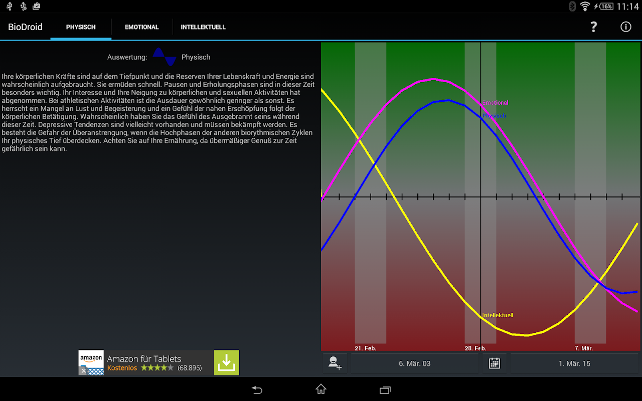 BioDroid determines your being for any day in your life using the theory of biorhythms for the physical, emotional and intellectual strength.