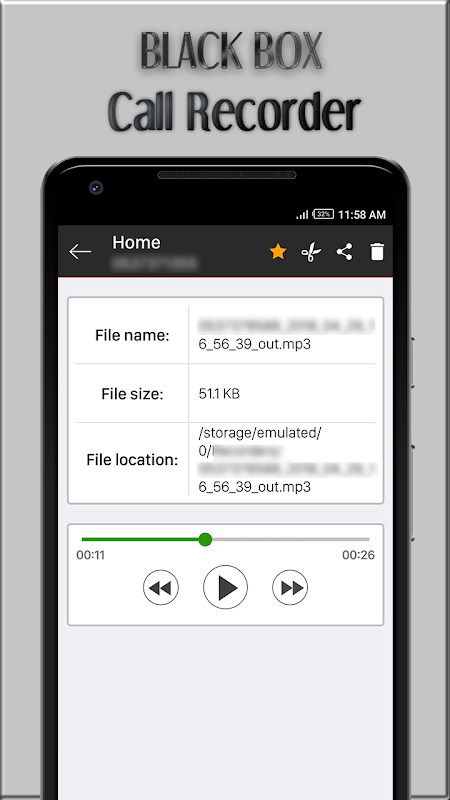 Aplikacja Black Box Call Recorder pozwala nagrywać rozmowy telefoniczne i porządkować nagrywanie plików w inteligentny sposób dzięki wielu funkcjom, takim jak odtwarzanie, słuchanie, udostępnianie, usuwanie, przycinanie nagrań i zmiana nazw nagrań rozmów, wiele formatów audio, dodawanie do ulubionych, dyktafon itp.