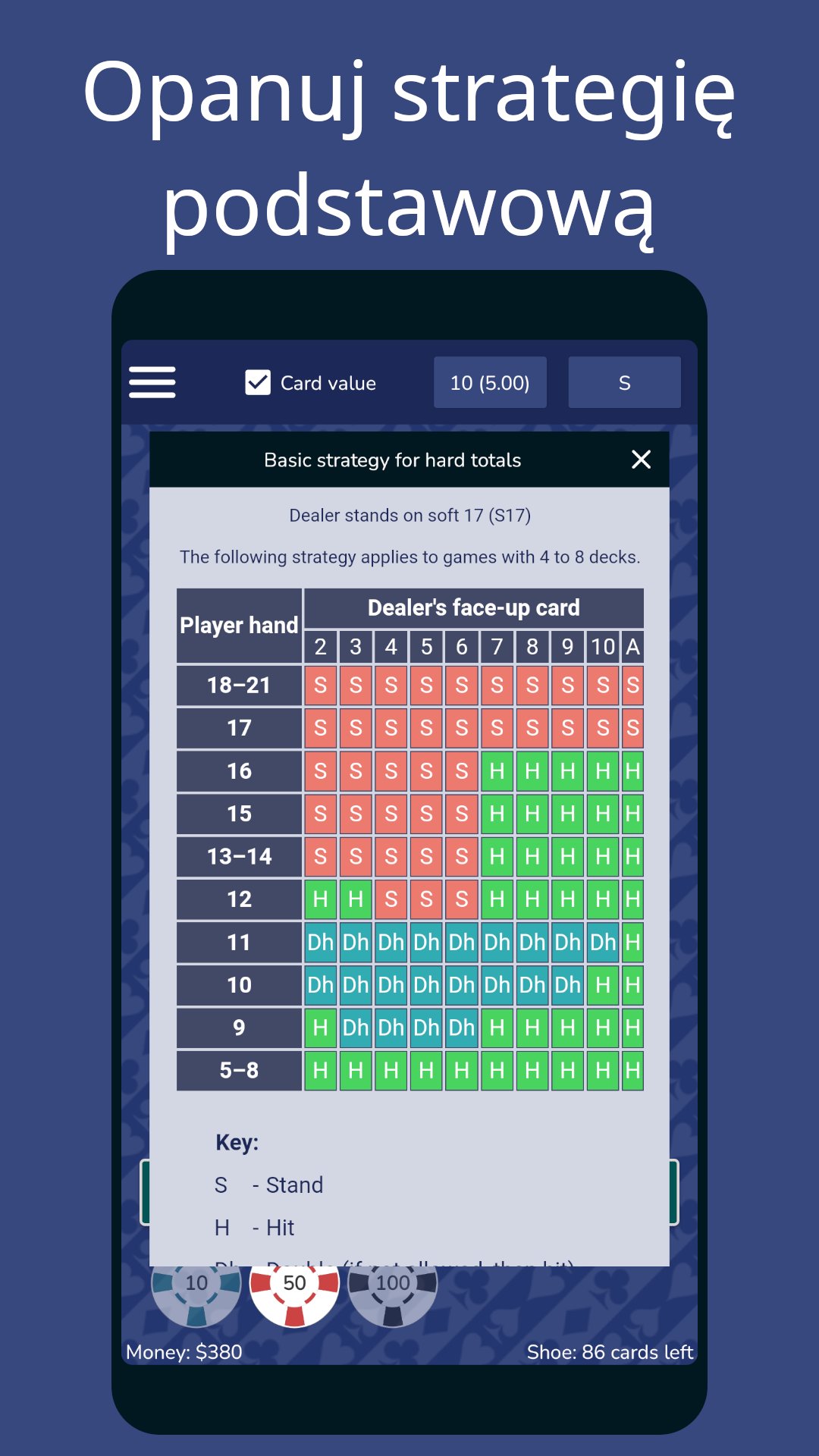 Blackjack: Liczenie kart i strategia to emocjonująca gra oraz trener w jednym. Blackjack to gra kasynowa, na wynik której można wpływać dzięki odpowiedniej wiedzy oraz umiejętnościom. Stań się zawodowym graczem trenując liczenie kart oraz poznając strategię podstawową. Ta aplikacja pomoże Ci w opanowaniu obu metod. Graj i ucz się jednocześnie, szlifuj swoje umiejętności z łatwością i w krótszym czasie. Trenuj posługiwanie się metodą Hi-Lo - najpopularniejszym systemem liczenia kart. Przekonaj się sam, że możesz pokonać krupiera!