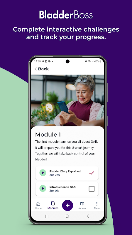 BladderBoss oferuje edukacyjny i interaktywny, ośmiotygodniowy program opracowany przez wiodących światowych ekspertów w dziedzinie nadreaktywnego pęcherza, specjalizujących się w fizjoterapii, psychologii i uroginekologii. Program składa się z ośmiu łatwych do zrozumienia, cotygodniowych modułów, w których krok po kroku poznasz techniki poparte badaniami naukowymi i podejmiesz angażujące wyzwania. Stosując holistyczne podejście, BladderBoss wyposaży Cię we wszystkie narzędzia potrzebne do zrozumienia nadreaktywnego pęcherza, przeprogramowania pęcherza, zmiany zachowań, wzmocnienia mięśni dna miednicy i dążenia do osobistych celów – wszystko na Twoich własnych zasadach.