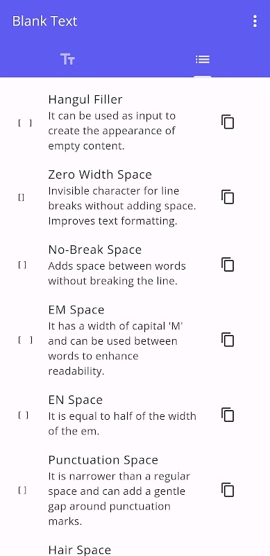 Oprócz niewidocznych znaków tekstowych aplikacja zawiera wiele przydatnych znaków WhiteSpace, takich jak spacja o zerowej szerokości, spacja EM, spacja interpunkcyjna, spacja bez łamania, spacja interpunkcyjna i inne. Po prostu dotknij, aby skopiować i bez wysiłku używać ich w swoim piśmie.