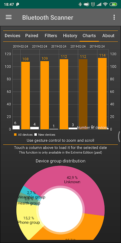 - Odtwarzanie dowolnego skanowania w historii, wyświetlanie wszystkich urządzeń BT w przeszłości