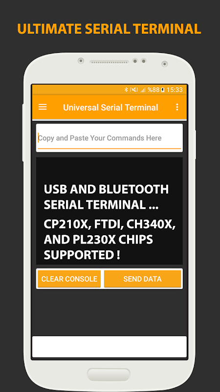 Port szeregowy aplikacja Terminal dla USB i Bluetooth wbudowany w urządzeniach. W trybie SPP USB, wszystkie popularne USB to Serial TTL chipy są obsługiwane, takich jak; FTDI, CP210X, CH340X i PL230X. Wszystkie otrzymane dane szeregowe wyświetlane na konsoli i App Jest to bardzo przydatna aplikacja dla szeregowych w debugowania aplikacji komunikacyjnych, takich jak internet rzeczy i tak dalej.