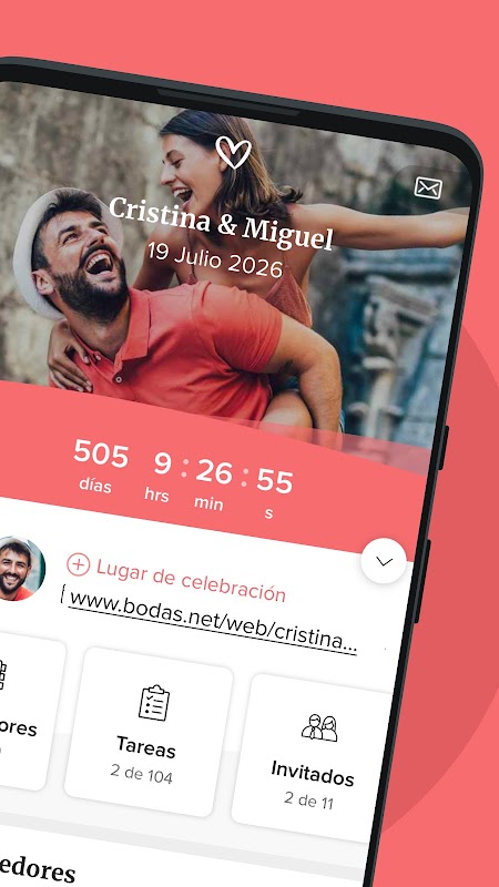 Ślub na horyzoncie? Ślub będzie przyjemniejszy, gdy wszystko zorganizujesz z darmową aplikacją Bodas.net. Pobierz ją już teraz i miej szczegóły ślubu zawsze pod ręką, aby planowanie było łatwe i przyjemne.