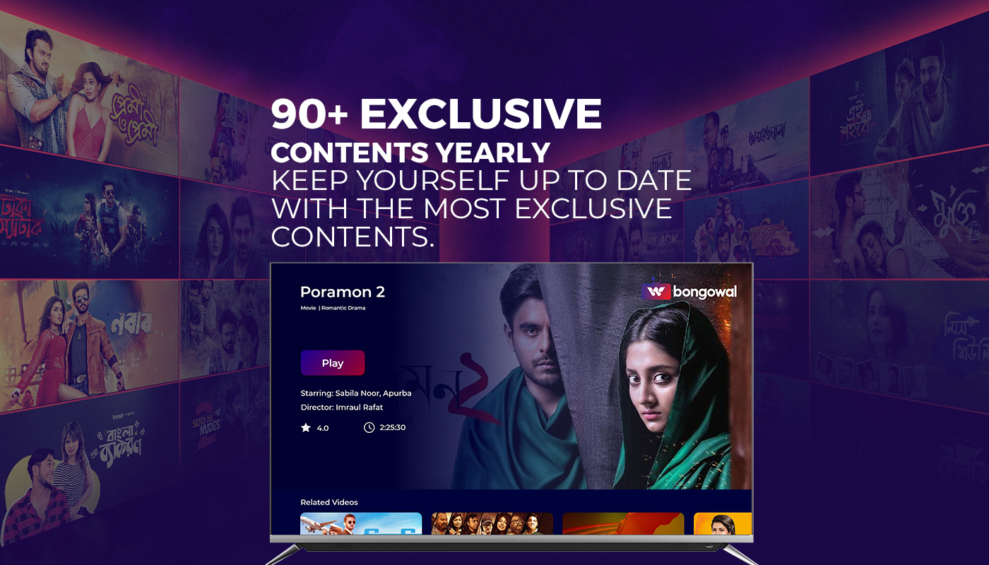 BongoWAL to platforma do strumieniowego przesyłania wideo na żądanie tylko dla Walton i Marcel Android TV w Bangladeszu. Ciesz się EKSKLUZYWNYMI treściami ze swojego Android TV Walton/Marcel, zanim ktokolwiek inny. Subskrybuj największą na świecie bibliotekę treści Bangla z ponad 50 popularnymi Bangladeszami i międzynarodowymi kanałami telewizyjnymi na żywo. Subskrybuj teraz, aby uzyskać dostęp do ponad 15 000 godzin filmów bengalskich, seriali internetowych, programów telewizyjnych, międzynarodowych treści z dubbingiem Bangla oraz bogatej kolekcji treści dla dzieci. Zdobądź to, co najlepsze w bengalskiej rozrywce, na którą zasługujesz!