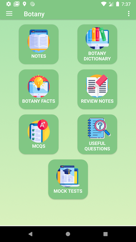 Ta aplikacja botaniczna zapewnia mcq w trybie offline z botaniki, quizy MCQ, symulacyjne testy z botaniki, słownik botaniki, notatki z botaniki, pytania z wywiadów botanicznych do wszelkiego rodzaju egzaminów i testów konkurencyjnych. Dzięki tej aplikacji do botaniki uczniowie mogą z łatwością doskonalić swoje umiejętności. Ta aplikacja botaniczna pomaga uczniom uczyć się pojęć botaniki bez burzy mózgów, absorbując wiedzę dostarczoną w łatwym do zapamiętania / odczytania formacie, odkładając niepotrzebne długie i szczegółowe teksty.