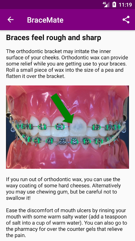 Ma łatwy w użyciu ekran, który pozwala użytkownicy widzą, jak wyglądają ich aparaty ortodontyczne z różnymi wzorami i wieloma kolorami. Niektóre aplikacje mają rysunkowy obraz zębów, który utrudnia wizualizację wyglądu aparatu. BraceMate pokazuje obraz przypominający życie, aby był jak najbardziej realistyczny. Niektóre inne aplikacje pozwalają zobaczyć, jak wyglądają zęby tylko z jednym zestawem kolorów na raz. Aplikacja BraceMate pozwala zobaczyć, jak wyglądają Twoje zęby z różnymi wzorami kolorów. Możesz wspierać swoją drużynę lub barwy narodowe. Możesz dopasować swój strój na następne spotkanie towarzyskie.
