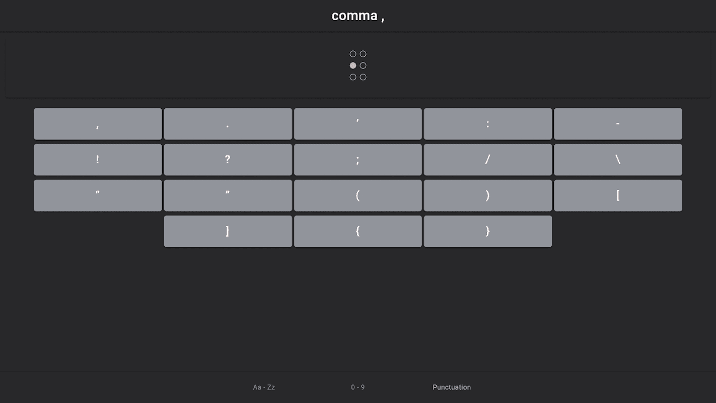 Easily look up Braille letters (Aa - Zz), numbers (0 - 9), or common punctuation marks.