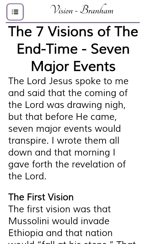 Pierwsza wizja, że Mussolini będzie inwazji na Etiopię i że naród "spadnie na jego kroków." Ta wizja na pewno nie powodować pewne skutki, a niektóre były bardzo zły, gdy powiedziałem to i nie byłoby w to uwierzyć. Ale stało się to w ten sposób. On po prostu poszedł tam z jego współczesnych ramion i przejął. Tubylcy nie miał szans. Ale wizja powiedział także, że Mussolini przyjdzie straszny koniec z jego ludzie zwracając na niego. To stało się dokładnie to, co zostało powiedziane.