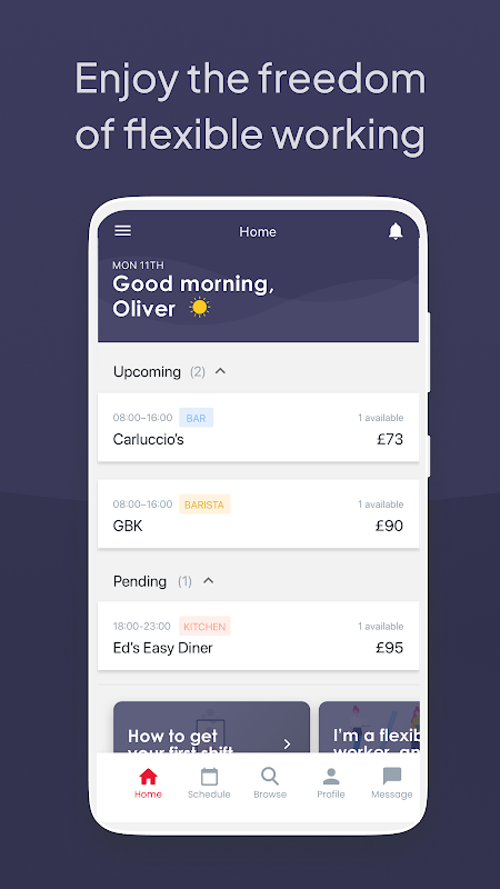 Bardzo łatwo jest zacząć. Po prostu zarejestruj się, zbuduj swój profil i gotowe. Możesz pracować na zewnątrz w Ed's Easy Diner w poniedziałek, w kuchni w GBK w czwartek i za barem w Giraffe w sobotni wieczór.