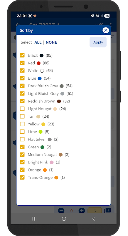 - Następnie aplikacja w przejrzysty i przyjazny dla użytkownika sposób przedstawi listę wszystkich części i minifigurek należących do zestawu