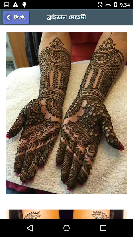 Mehndi design is a very important part for bridal makeup. Marriage day is very special and Bridal makeover is even more special. Bridal Mehdi design is an age-old tradition in Bangladesh. This free Bangla app has Bridal mehndi designs 2017 latest. One can use many bridal mehndi design image provided in this app to decorate bride during marriage ceremony; also this design can be used for festivals like Pahela Baisakh, 21 February, victory day (16 December), wedding, birthday, happy new year etc. Use these mehndi designs all types to take makeup. This mehndi design app requires no internet connection and all mehndi designs 2017 latest offline compatible. If you run beauty parlor, can use this mehdi designer 2017 app as your beauty tips in Bangla. Recently researches proved that henna designs (also known as temporary tattoo) are more friendly to human health as it does not contains any artificial chemicals. So, women now prefer henna mehndi design over cosmetics. To decorate your hand or finger beautifully there are many tattoo design apps. Our app is a beginners guide (mehendi tutorial) with tips on how to draw henna designs. So, use these mehandi designs free image and be a cute bride!