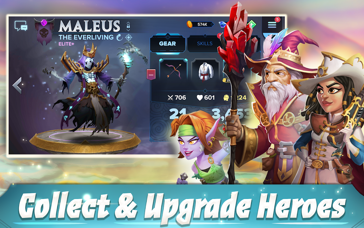 • Stwórz idealny zespół - Zbierz i ulepsz ponad 50 pięknie narysowanych bohaterów fantasy z pięciu unikalnych frakcji z całego królestwa!