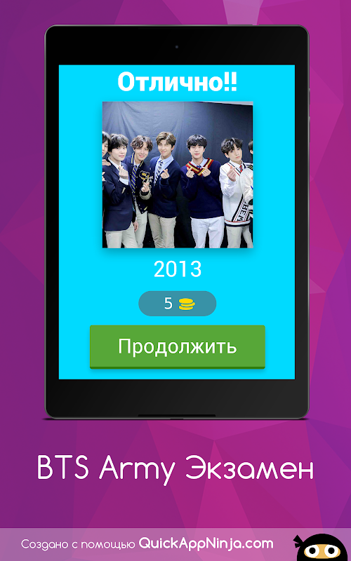 Докажите что вы достойны быть в BTS A.R.M.Y. Узнайте много новой информации о своих айдолах и станьте частью фан группы БТС.
