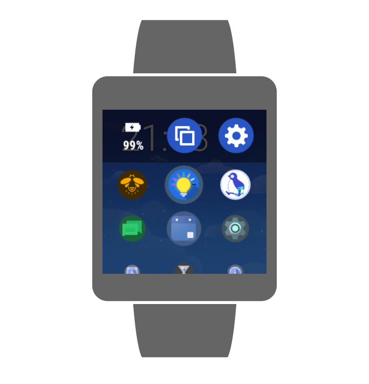 Bubble Launcher dla Androida Wear to pierwsza animowane i inteligentna aplikacja launcher dla Androida Wear SmartWatch. Otwórz zegarek aplikacje szybko poprzez animowanego wyrzutni po lewej stronie ekranu. Aplikacje są wyświetlane w postaci pęcherzyków i są sortowane automatycznie przez wykorzystanie. Skorzystać z wbudowanych w menedżera okien, aby przełączać się pomiędzy otwartymi aplikacjami. Użyj przycisku Ustawienia na głowie ekranu laucher do szybkiego dostępu do menu ustawień dla noszeniu.