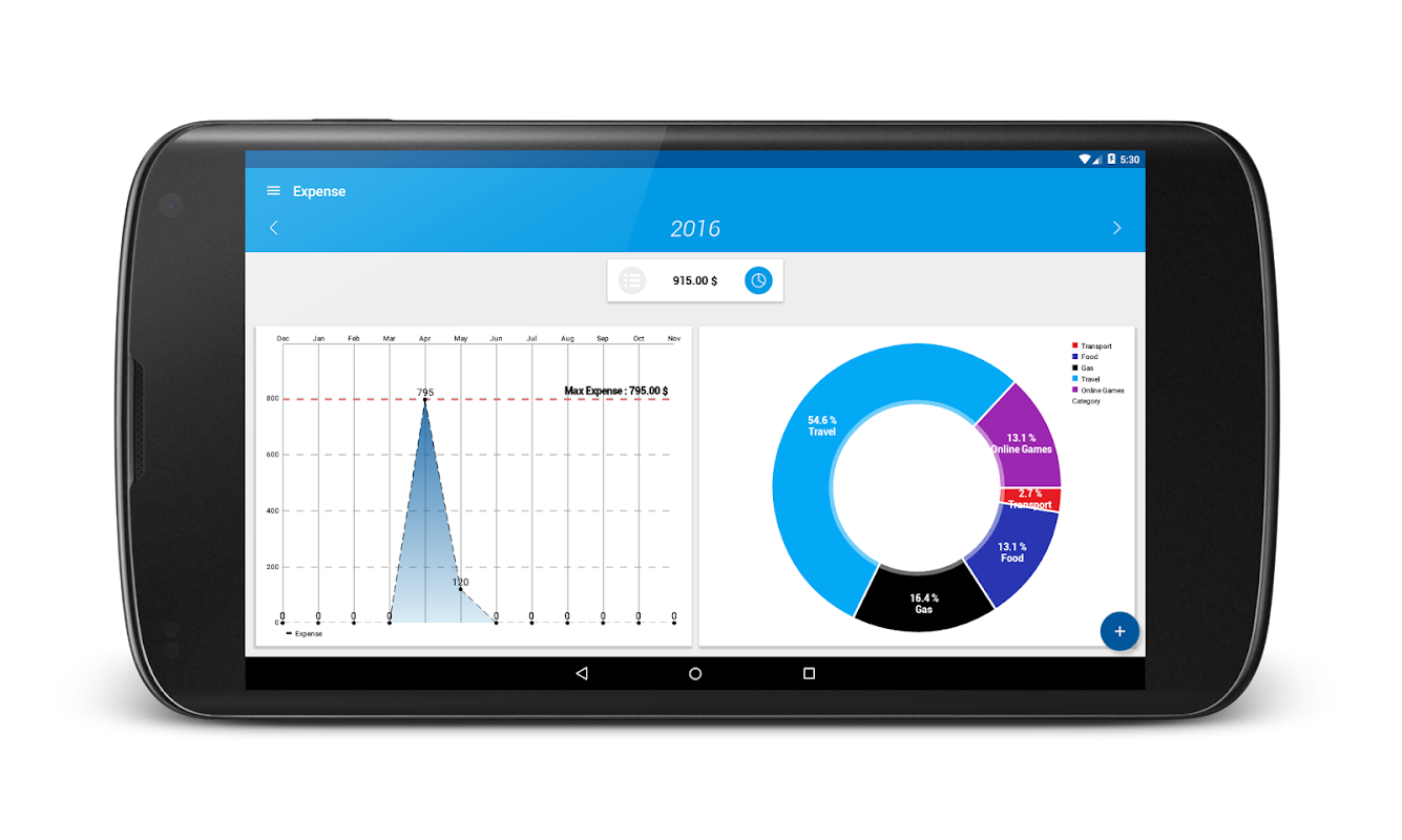 Analizując swoje wydatki przez przedziału dat jest intuicyjny (tygodniowe, miesięczne lub za cały rok), także według kategorii transakcji, na liście transakcji pieniądze, a także na głównej tablicy rozdzielczej, która wznowić aktualny stan portfela, także samym terminie przedziale partycji, zapewniając jesteś obecny bilans pieniądze, łączna kwota dochodów i wydatków.