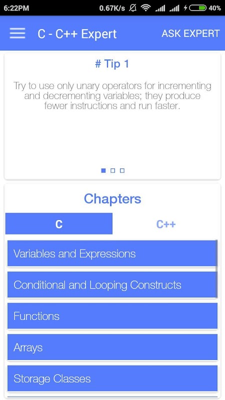 C - C++ Expert is a Quiz app to test your C , C++ programming skills. You can also ask your C , C++ programming queries to expert, who will respond with appropriate solution.