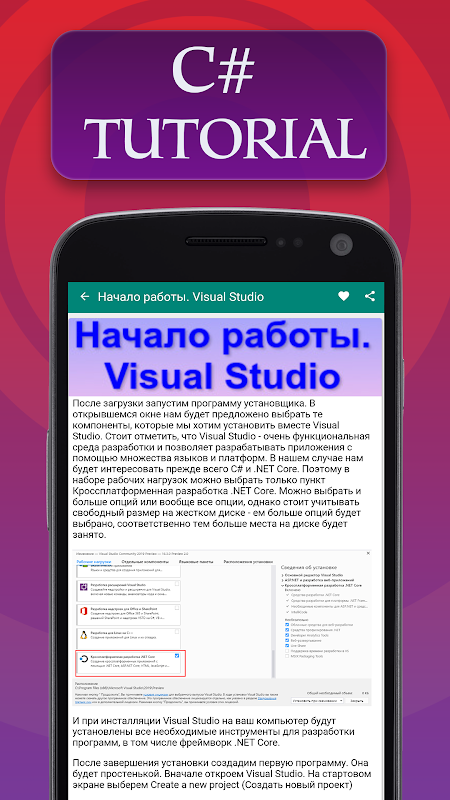 Poznaj C # - .NET Programowanie Samouczek to aplikacja do nauki obejmująca wszystkie podstawy języka programowania z .Net i .ASP dla początkujących.