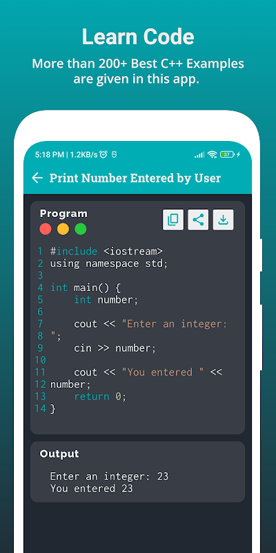 Nasza aplikacja C++ Programs zawiera ponad 200 ćwiczeń C++ z wynikami.
