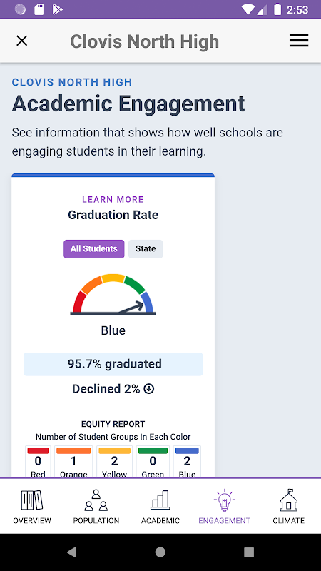 Kalifornijczycy mogą korzystać z aplikacji mobilnej CA Dashboard w celu łatwego dostępu do informacji na podstawie Kalendarza szkolnego w Kalifornii. Pulpit nawigacyjny to nowy system odpowiedzialności w Kalifornii, który pomaga rodzicom i nauczycielom zidentyfikować mocne strony i obszary wymagające poprawy. W Dashboard w Kalifornii opisano, w jaki sposób dzielnice, szkoły (w tym alternatywne szkoły obsługujące uczniów wysokiego ryzyka) oraz grupy studentów prowadzą działania w różnych stanach i reagują na lokalne wskaźniki.