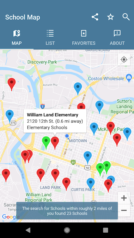 Aplikacja CA Szkoły pomaga szukać pobliskich szkołach kalifornijskich.