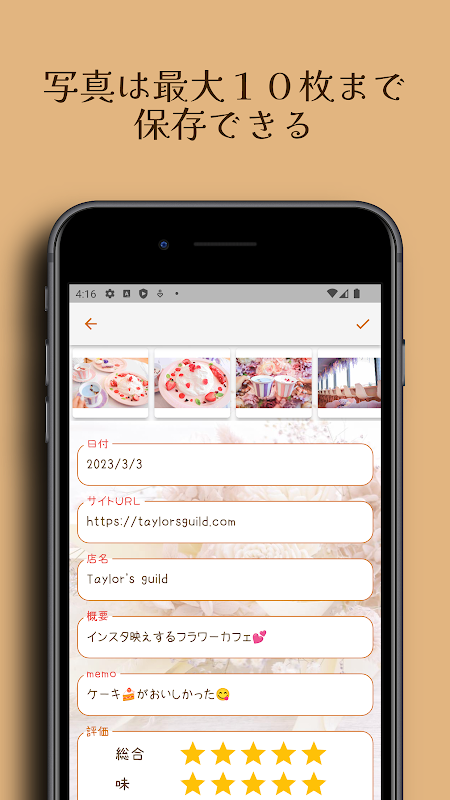 Możesz zarejestrować swoją samoocenę jako ocenę w gwiazdkach w krokach co 0,5 w 5-stopniowej skali dla ogólnego, smaku, wyglądu, atmosfery i obsługi klienta.