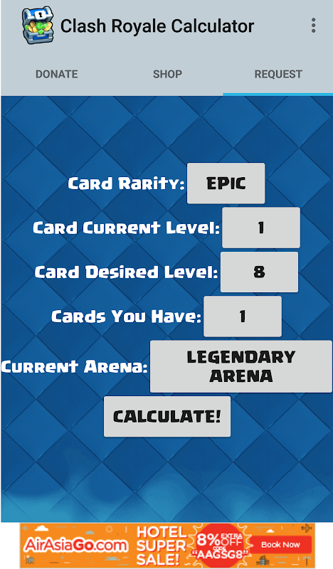 Feature 1: Frequently donates to your clan? Want to see how much you need to donate to earn x amount of gold? We have it made easy for you! Simply enter the gold you need and the application will tell you how much commons you need to donate and also the rares you need to donate.